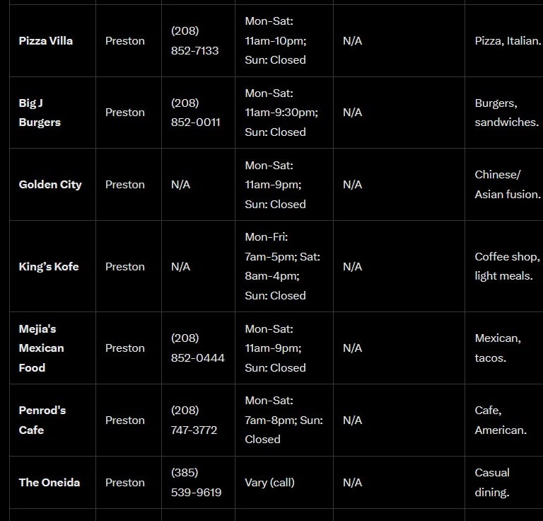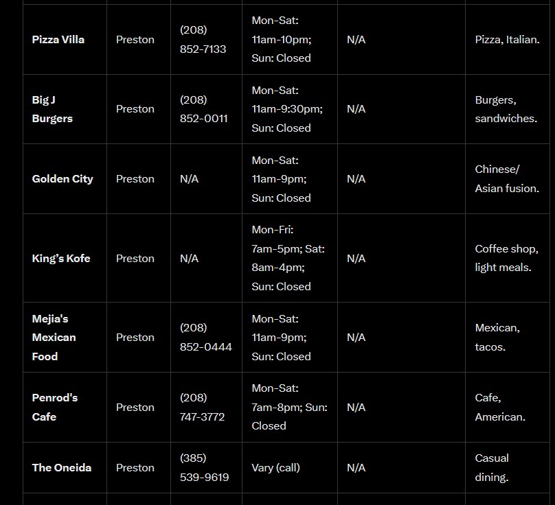 Napoleon Dynamite Sites Tour (Preston): Self-guided tour of film locations (Preston High School, houses). Phone: N/A (Preston Chamber). Website: prestonidaho.net/community/tourism.